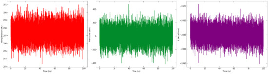 The potential energy, pressure, and temperature of the system over a 100 ns MD simulation, as obtained from the NAMD (nanoscale molecular dynamics) log file, is shown in Figure 9. The graph demonstrates that the potential energy, pressure, and temperature remained constant throughout the 100 ns simulation.