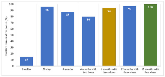 The positive humoral response over time from baseline (prior to SARS-CoV-2 vaccination) to 12 months after completing the initial vaccine schedule (i.e., 2 doses of mRNA vaccine) in CKD patients on peritoneal dialysis. A positive humoral response was defined as anti-spike antibody titers above 36 UI/mL. Note that samples obtained at 6 and at 12 months following the initial vaccine schedule of two doses of mRNA-based vaccines are divided into patients that had received 2 (just the initial schedule) or 3 doses (initial schedule plus one booster dose) at the 6-month timepoint or 3 or 4 doses (12-month timepoint).