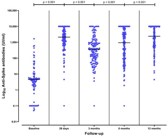Humoral response varied during the follow up. At baseline, 15 (15%) of the 102 tested patients presented positive humoral responses because of previous SARS-CoV-2 infection. Twenty-eight days after complete vaccination, 138 (96%) of the 143 tested patients presented positive humoral responses (Figure 1). Among the 81 patients without a humoral response at baseline, 78 (96%) seroconverted after vaccination. Anti-spike antibodies were significantly higher one month after vaccination than at baseline (4 [2–7] UI/mL vs. 2109 [775–5982] UI/mL, p < 0.001) (Figure 2).