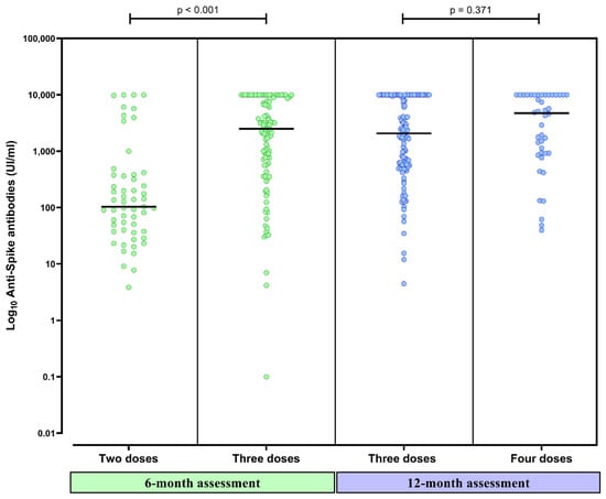 Anti-spike antibody titers significantly increased at 6 months in comparison to 3 months (931 [96–6035] UI/mL vs. 356 [95–992] UI/mL, p < 0.001) (Figure 2). Patients that had received a third dose had higher anti-spike antibody titers at 6 months than patients with only two doses (2499 [564–8657] UI/mL vs. 100 [37–365] UI/mL, p < 0.001) (Figure 3). The median time elapsed between the third dose and the 6-month assessment was 32 (20–51) days.