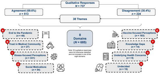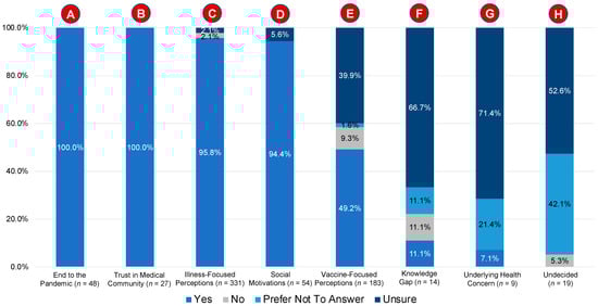 Vaccine refusers were a cohort of 26 individuals who responded “no” to the primary statement. None of the domains clearly represented vaccine refusers. Rather, the 26 persons who responded “no” were a heterogeneous group represented by four domains: Illness-Focused Perceptions (C), Vaccine-Focused Perceptions (E), Underlying Health Concerns (G), and Undecided (H). The majority of “no” respondents (65.4%; 17 of 26) were represented by the Vaccine-Focused Perceptions domain (E). Interestingly, upon examination, most of the “no” responses across the four domains (C, E, G, and H) were more suggestive of being in the moveable middle than being true vaccine refusers. Thus, while these individuals responded “no” to the primary statement, their qualitative feedback indicates something different—that they may indeed be temporary “no” respondents, pending additional information and education. Qualitative feedback from “no” respondents who may be thought of as being part of the moveable middle included the following: