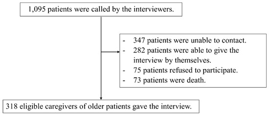 Of the 1095 patients contacted, 318 (29.0%) had caregivers who declared themselves as the patients’ representatives; these caregivers were enrolled in the study (Figure 1). Among the 318 participants, 127 (39.9%) were hesitant to authorize COVID-19 vaccination for the dependent older adults under their care, whereas 191 (60.1%) showed no hesitancy.