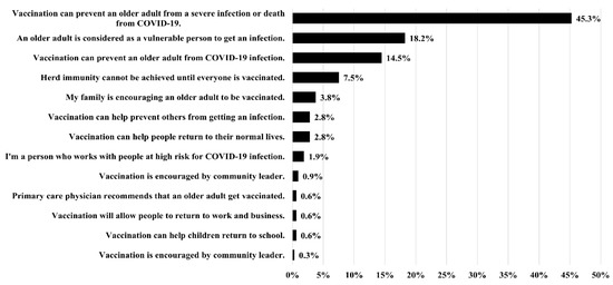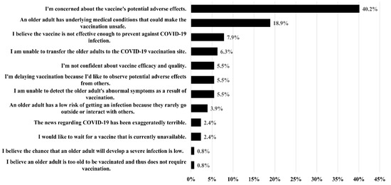 As shown in Table 5, 39.9% of the caregivers were hesitant to authorize COVID-19 vaccination of the older adults under their care, and 13.5% refused to authorize vaccination. In total, 96.2% of the caregivers intended to be vaccinated against COVID-19 themselves, while 76.7% had already been vaccinated. The most common reasons for COVID-19 vaccine hesitancy among the caregivers were concerns regarding adverse effects (40.2%), possible complications caused by an underlying disease (18.9%), and the belief that the vaccines are not effective for preventing COVID-19 infection (7.9%) (Figure 2). The most common reasons for supporting vaccination of older adults were as follows: COVID-19 vaccines can prevent severe infection and death (45.3%); dependent older adults are a vulnerable group (18.2%); and COVID-19 vaccines can prevent COVID-19 infection in older adults (14.5%) (Figure 3). Compared with caregivers exhibiting vaccine acceptance, those who refused to authorize COVID-19 vaccination of the dependent older adults under their care were more likely to show vaccine hesitancy (OR = 3.779; 95% CI: 1.652–8.648, p = 0.002). Caregivers who stated that the manufacturer of the COVID-19 did not influence their decision to authorize vaccination were less likely to exhibit vaccine hesitancy (OR = 0.267; 95% CI: 0.152–0.471, p < 0.001).