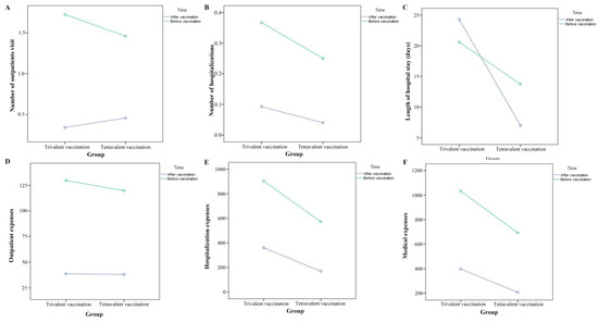 The variation in number of outpatient visits, the number of hospitalizations, the total medical cost of patients, outpatient expenses, hospitalization expenses, and the length of stay of patients before and after influenza vaccination among two groups. (A) number of outpatient visits; (B) number of hospitalizations; (C) length of hospital stay; (D) outpatient expenses; (E) hospitalization expenses; (F) total medical cost.