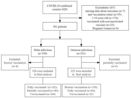 A retrospective cohort study involving 828 cases was conducted in three COVID-19 designated hospitals in China, with 166 from Eighth People’s Hospital of Guangzhou (the Delta variant) from 21 May to 18 June 2021, 243 from the First Affiliated Hospital of Xiamen University (the Delta variant) from 10 September to 3 October 2021, and 419 from the Second People’s Hospital of Lanzhou City (the Omicron variant, BA.2.38) from 11 July to 26 July 2022. These cases were all consecutive cases with real-time fluorescence quantitative PCR (RT-PCR)-confirmed COVID-19 and were local cases from the same transmission chain in each city. As COVID-19 vaccines were only provided to adults until July 2021 according to the nation’s policy, those younger than 18 years old were excluded. The following cases were also excluded: those who were pregnant; those who were vaccinated with non-inactivated vaccines; and those with no information regarding clinical outcomes or vaccination status. The China government recommended a booster vaccination (3 doses) in October 2021. As a result, only 4 Delta cases received booster shots and 6 Omicron cases were partially vaccinated (1 dose), and these cases were also excluded. All cases infected with SARA-CoV-2 in our study were hospitalized regardless of disease severity.
