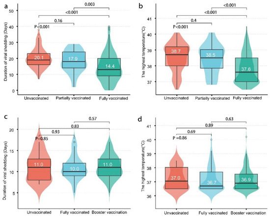 The duration of viral shedding and the highest temperature after Delta (a,b) and Omicron (c,d) infections. (a) The duration of viral shedding and (b) the highest temperature in Delta cases. As the dose of vaccines increased, the duration of viral shedding and the highest temperature decreased in Delta cases. (c) The duration of viral shedding and (d) the highest temperature in Omicron cases. No differences were found between different vaccination groups in the highest temperature or duration of viral shedding in Omicron cases. Boxes depict the interquartile range (IQR) and contain the median (black line) with whiskers spanning 1.5 times the IQR. The shaded area reflects the data distribution.