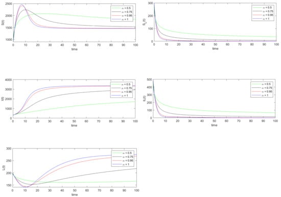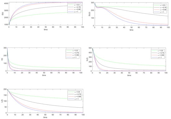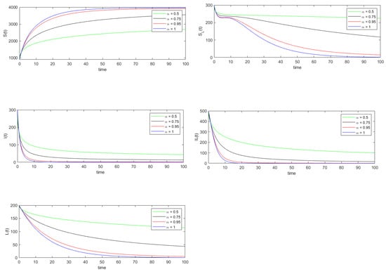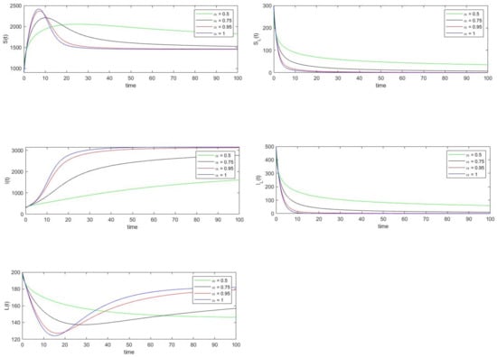 where and represent the exact and approximated values of the variable at for As can be seen from Table 3, the relative error of each state variable decreases as the value of increases from 0.5 to 1.