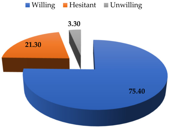 Figure 2 shows that the percentage of parents who were willing to vaccinate their children dominated that of those who were hesitant or unwilling. Yılmaz et al. [39] reported that approximately 36% of the parents were willing to vaccinate their children while almost 64% of them were unwilling to vaccinate their children. Goldman et al. [47] found that approximately 65% of the parents were willing to vaccinate their children while almost 35% of them were unwilling to vaccinate their children. Study sample size, location, and period might contribute to the differences between results in the current study and previous studies.