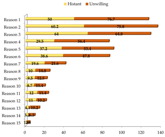 Figure 3 shows that the three most common reasons that made parents unwilling/hesitant to vaccinate their children were the concern about side effects (Reason 1), the probability that their children might be suffered from myocarditis and pericarditis (Reason 2), and the long-term impact of COVID-19 vaccines on their children’s fertility (Reason 3). Particularly, 76.7% and 50% of the parents who concerned about the side effects of the vaccines were unwilling and hesitant to vaccinate their children, respectively. In addition, 75.8% and 60.2% of the parents were concerned that their children might have suffered from myocarditis and pericarditis were unwilling and hesitant to vaccinate their children, respectively. In addition, 64.8% and 64% of the parents concerned about the long-term impact of COVID-19 vaccines on their children’s fertility were unwilling and hesitant to vaccinate their children, respectively.