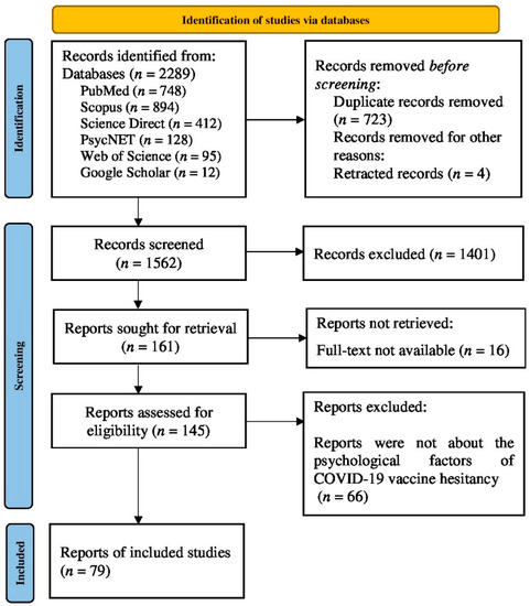 An initial search on five electronic databases yielded 2289 records, of which 748 were from PubMed, 894 from Scopus, 412 from Science Direct, 128 from PsycNET, and 95 from Web of Science. Further, an additional 12 studies were identified via the Google Scholar search. After deduplication and removal of retracted items, the remaining 1562 records were screened for selection based on the inclusion criteria (Figure 1). Subsequently, 1401 records were removed after the title and abstract screening. Of the 161 reports sought for retrieval, the full text was not available for 16 studies. The remaining 145 reports were assessed for eligibility. The full-text analysis excluded 66 reports that were not about the psychological factors of COVID-19 vaccine hesitancy. Thus, the final analysis included 79 quantitative studies on COVID-19 vaccination with an emphasis on the psychological factors associated with vaccine hesitancy.