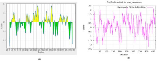 To predict the B cell and antigenicity in the VP2 protein of the IBDV, BepiPred-2.0: Sequential B-Cell Epitope Predictor and Hydropath/Kyte & Doolittle methods were used, respectively. Using a Random Forest algorithm trained on epitopes and non-epitope amino acids with a threshold value set above 0.5 for all servers, the BepiPred-2.0 Sequential B-Cell Epitope Predictor server forecasts B-cell epitopes from a protein sequence. Briefly, an amino acid sequence was fed to IEDB tools for B-cell epitope prediction, and those which reside in a yellow color above the threshold (0.5 value) are the predicted epitopes, whereas the Y-axes depict residue scores and X-axes residue positions in the sequence. For predicting antigenicity, the sequence was fed to IEDB and Hydropath/Kyte & Doolittle methods using a threshold value of 0.5. The Y-axes represent the residue score and X-axes residue positions in the sequence.