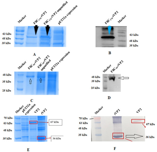 (A) SDS-PAGE of FliC176-tVP2. (B) Western blot analysis of FliC176-tVP2. (C) SDS-PAGE of FliC99-tVP2. (D) Western blot analysis of FliC99-tVP2. (E) SDS-PAGE of VP2; and tVP2 (F) Western blot analysis of VP2 and tVP2.