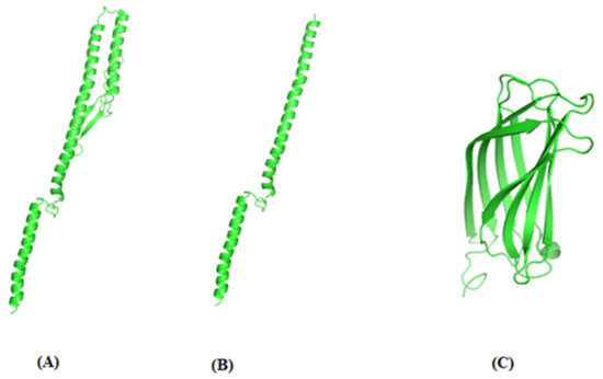 Predicted structure of (A) FliC176 and (B) FliC99 based on PDB ID: 1UCU. (C) Predicted structure of tVP2 199–356 based on PDB ID: 2DF7 using PyMOL2.5.