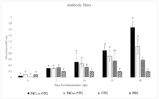 Three chickens from each group (n = 3) were immunized with the FliC176-tVP2, FliC99-tVP2 tVP2 and PBS. Sera were analyzed by indirect ELISA using tVP2 as coating antigen (10 µg). The bar chart shows the antigen-specific antibodies of the immunized chicken. Data are presented as mean ± SEM. Different letters indicate significant differences (p < 0.05) between treatment groups at the same time point.