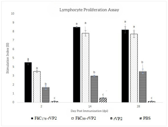 Each group’s chickens (n = 3) were immunized with the FlIC176-tVP2, FliC99-tVP2, tVP2 and PBS. PMBCs were collected, and after stimulation with tVP2, lymphocyte proliferation was analyzed using an MTT assay. Data are presented as mean ± SEM. Different letters indicate significant differences (p < 0.05) between treatment groups at the same time point.