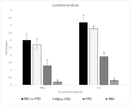 Peripheral blood mononuclear cells (PBMCs) were taken from chickens (number of chickens in each group = 3) and treated with 10 μg/mL of the tVP2. Expression levels of the cytokines, such as IFN-γ and IL-4, were determined. Data are presented as mean ± SEM. Different letters indicate significant differences (p < 0.05) between treatment groups at the same time point.