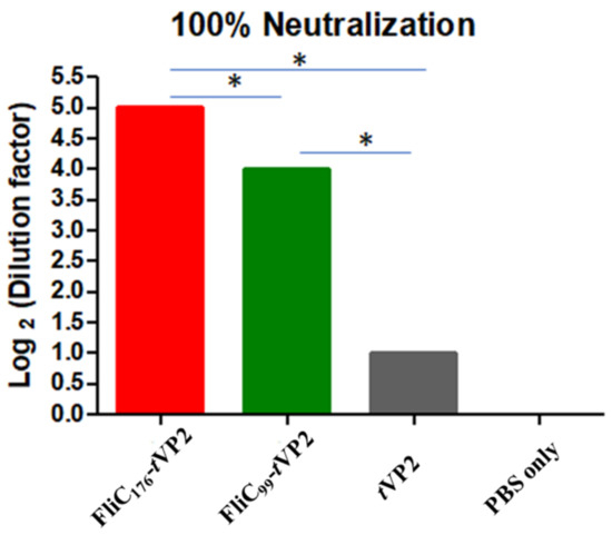 On day 28, after vaccinations, the serum samples were used for the neutralization assay with 100 TCID50 of the Infectious Bursal Disease Virus. The serum sample of the FliC176-tVP2 group neutralized the virus up to the 5th dilution of the log2, while on the other hand, serum of FliC99-tVP2 neutralized the virus up to the 4th dilution of the log2. In the tVP2 serum, only the 1st dilution of the log2 neutralized the virus, whereas neutralization was not noticed in the PBS-only group (Figure 7 and Figure S3).