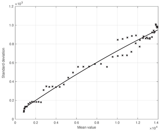 Standard deviation of the local fluctuations of a real SARS-CoV-2 Italian positive test sequence from 21 September to 20 November 2020, illustrated in Figure 1, as a function of their expected value. The continuous line represents the best fit with a degree 2 polynomial model, which in this case is reduced to a straight line.