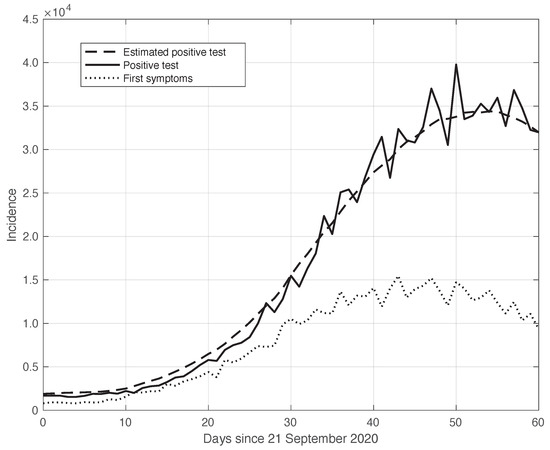 Relationship between the sequences of the positive test (continuous line) and the first symptoms (dotted line) relative to the real SARS-CoV-2 Italian data from 21 September to 20 November 2020, illustrated in Figure 1. The curves were obtained by correcting the data from a one-week periodic component (see Section 2.2). The dashed line shows the results of the convolution between the first symptoms sequence and the optimal kernel (see Section 2.3).