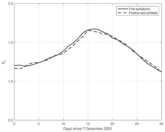 Sequence of the reproduction number estimated by the standard method for real SARS-CoV-2 Italian data from 7 December 2021 to 6 January 2022. The continuous and dashed lines refer to the first symptoms and the shifted positive test sequences, respectively. The estimated optimal shift is 4 days.