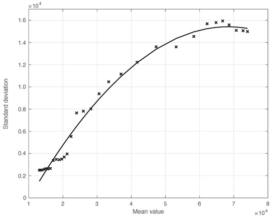Standard deviation of the real SARS-CoV-2 Italian first symptoms sequence from 21 September to 20 November 2020, illustrated in Figure 1, as a function of their expected value. The continuous line represents the best fit with a degree 2 polynomial model.
