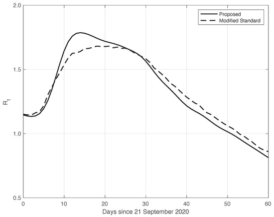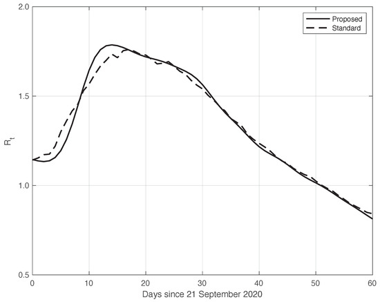 Sequence of the reproduction number for real SARS-CoV-2 Italian data from 21 September to 20 November 2020, illustrated in Figure 1. The continuous line corresponds to the proposed method, while the dashed line corresponds to the standard approach.