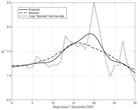 Sequence of the reproduction number for real SARS-CoV-2 Italian data from 7 December 2021 to 6 January 2022. The continuous line corresponds to the proposed method, the dashed line to the standard approach, while the dotted line is relative to the estimation by (6) from the raw data.