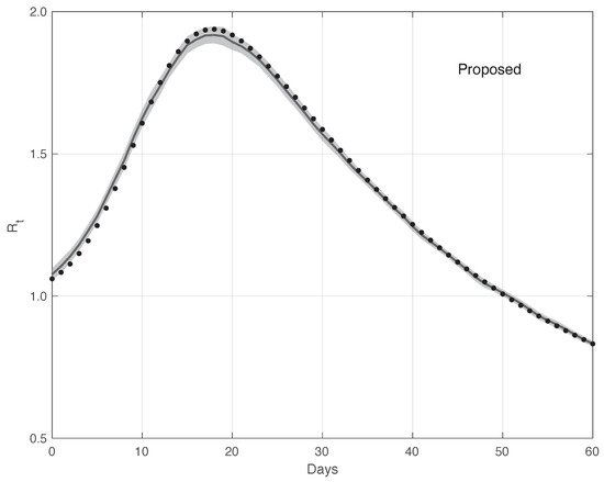 We now turn to the results obtained by the proposed method to evaluate the reproduction number during an epidemic for the first real dataset considered. They are illustrated in Figure 8, which also contains the results from the standard approach for comparison. As we can see, the curve from the proposed method is more regular than the curve from the standard approach. Around day 30, the differences between the two curves are small. This is not true for the first part of the interval, where the slope of the curve is high (until about day 15), because a systematic deviation appears: the estimate of the with the proposed approach shows a higher slope than that estimated in the standard case. In contrast to this latter approach, in the proposed one, we first reduced both the systematic and random errors in the data, and then we applied the estimator in (6). As an alternative, one could first apply the same formula to the data after reducing the systematic errors and then perform an arithmetic averaging of in the interval . The result is shown in Figure 9, where it can be noticed that the proposed method outperforms this last procedure.