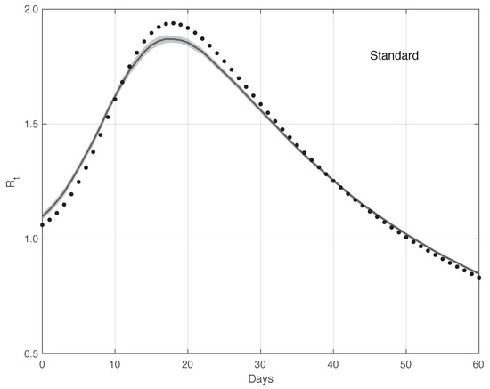 where denotes the convolution discretized by a linear combination of data, and is a temporal interval containing time t. Intuition suggests that the choice of to be symmetrically centred in t can be adopted to minimize a possible bias of the estimator. To obtain this formula, it is assumed that the instantaneous reproduction number is constant within . This hypothesis allows for a reduction of the influence of random errors in measurements during the estimation of . Mathematically, this is obtained by the two “averaging” terms appearing both in the numerator and the denominator of Equation (2). However, we stress that this procedure may induce systematic errors. In fact, the slope of the estimated is often reduced (in absolute value) with respect to that of the underlying “true” curve. Finally, the constancy over is independently assumed from time to time without any guarantee of consistency. The strategy adopted here aims to overcome the problem induced by the “averaging” procedure of the standard approach to estimate . Hence, we do not assume to be constant over the interval .