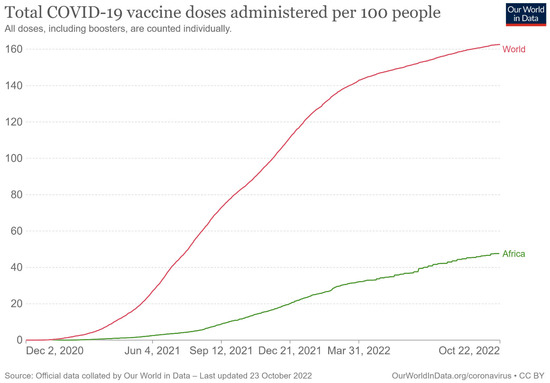 - Kamer, L. COVID-19 Vaccination Rate in Africa Compared to the World 2021–2022, Statista, 1 August 2022. Available online: https://www.statista.com/statistics/1245573/covid-19-vaccination-rate-in-africa-compared-to-the-world/ (accessed on 26 August 2022).