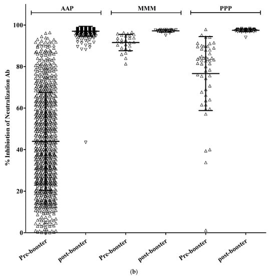 In the AAP group, Neut.Ab inhibition% was 44.0% (±23.6) before booster vaccination and 97.0% (±2.4%) after booster vaccination (p < 0.001). In the MMM group, before booster vaccination, Neut.Ab inhibition% was 91.6% (±3.9) and, after booster vaccination, Neut.Ab inhibition% was 97.2% (±0.6) (p < 0.001). In the PPP group, before booster vaccination, Neut.Ab inhibition% was 76.6% (±17.8) and, after booster vaccination, it was 97.5% (±0.6) (p < 0.001).