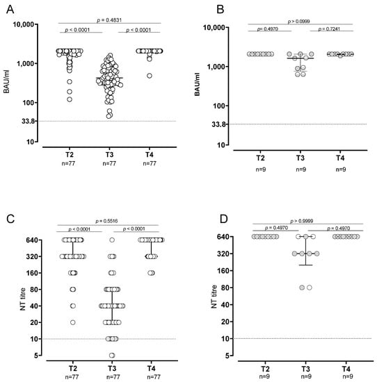 At T2, all SARS-CoV-2-naïve subjects developed positive levels of anti-spike antibodies, and 42/77 (54.5%) of them showed levels at the upper limit of the quantifiable range of the assay (>2080 BAU/mL). At T3, positive IgG response was still observed in all the subjects, although the levels significantly decreased (median level: 424.4, IQR 278.2–686.4 BAU/mL; p < 0.0001) and all the subjects were within the quantifiable range. At T4, after the booster dose, the levels increased again and the frequency of subjects showing levels >2080 BAU/mL (72/77; 93.5%) was significantly higher than that observed at T2 (p < 0.0001) (Figure 1A,B). The NT Abs titer followed the same kinetics. At T2, all naïve subjects showed a positive response of NT Abs and 9/77 (11.6%) subjects showed levels above the assay range (≥640). NT Abs titer decreased at T3, when all but two subjects still showed positive values (median titer: 40 IQR 20–80; p < 0.0001). Finally, at T4, the NT Abs titers increased again, returning positive in all the subjects (Figure 1C,D). All the nine SARS-CoV-2-experienced subjects showed anti-Spike antibodies >2080 BAU/mL at T2. Levels decreased at T3, when 3/9 (33.3%) subjects were >2080 BAU/mL (p = 0.0090), and increased again at T4, when 8/9 (88.9%) subjects were >2080 BAU/mL.