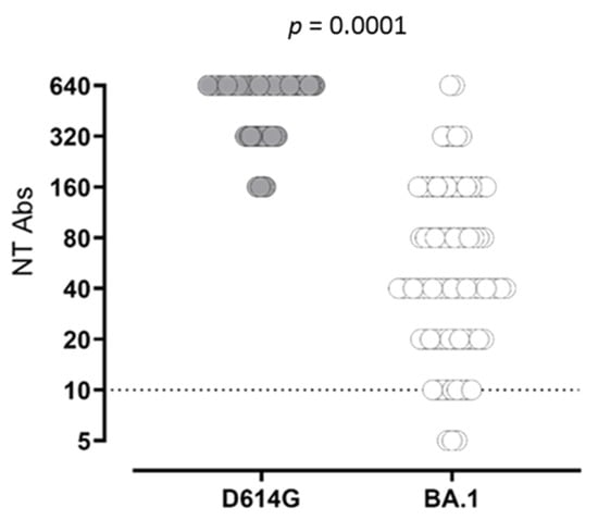 SARS-CoV-2 NT Abs response against wild-type strain D614G (grey dots) and BA.1 variant (white dots) was measured.