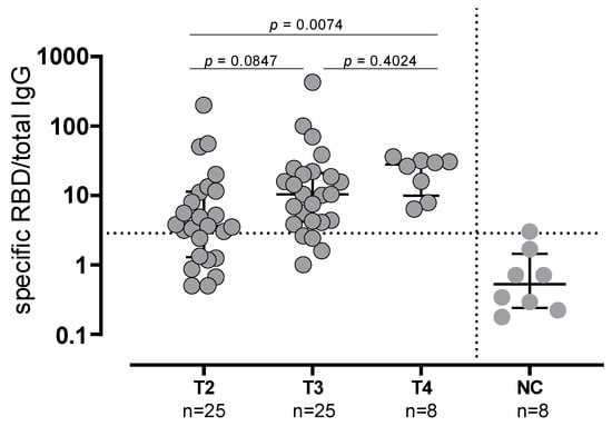 Spike-specific memory B cells secreting IgG antibodies evaluated in 25 subjects at T2 and T3 and in 8 subjects at T4. NC: negative controls.