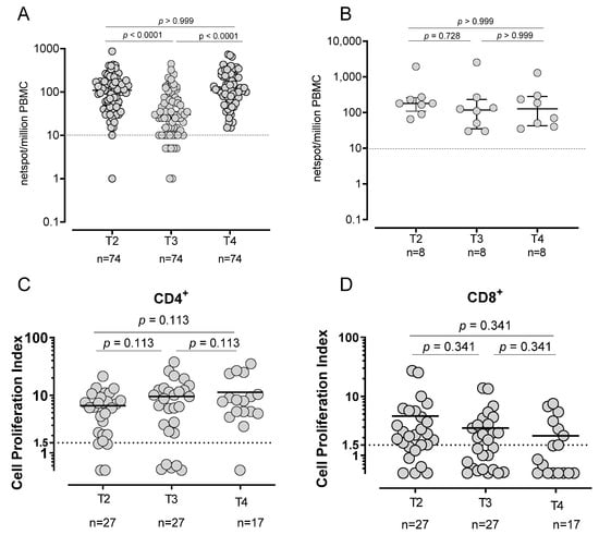 Spike specific T-cell response was evaluated in 82/86 subjects (95.3%; 74 SARS-CoV-2 naïve and 8 SARS-CoV-2 experienced). At T2, in all but one SARS-CoV-2-naïve subject T-cell response was positive (median frequency: 110 SFU/106 PBMC, IQR 49–175) and the large majority of them (67/74; 90.5%) maintained a positive Spike T-cell response at T3, although the levels decreased (median frequency: 30 SFU/106 PBMC, IQR 15–75; p < 0.0001). After the booster dose (T4), the frequency of Spike-specific T-cell increased again to levels similar to T2 (median frequency: 110 SFU/106 PBMC, IQR 73–231 (Figure 4A)). All SARS-CoV-2-experienced subjects preserved a Spike-specific T-cell response during all follow-ups and no significant differences were detected. In particular, no decline was observed at T3 (Figure 4B). While the number of IFNγ-producing T-cells decreased at T3, before increasing again after the booster dose, the T-cell proliferative response did not decrease but was sustained during the whole follow-up, since no significant differences were observed across the time points (Figure 4C,D).
