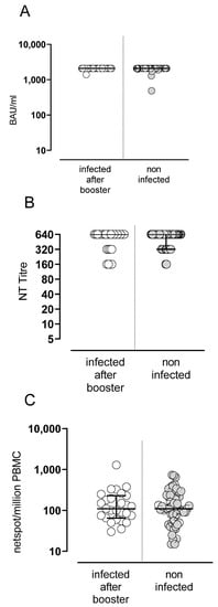 SARS-CoV-2 was not detected in the nasal swabs of any subject between T2 and T4. In addition, at T4, all SARS-CoV-2-naïve subjects showed a negative value for N-SARS-CoV-2 total IgG, suggesting that no SARS-CoV-2 infection occurred during the period of follow-up, during which the Apha and Delta VOCs were circulating. Subsequently, 26 subjects developed a SARS-CoV-2 infection (diagnosed by nasal swab testing) in a median time of 80 days (range 61–117) after the booster dose, during the circulation of the Omicron VOC. The infection was mildly symptomatic in all subjects, none of whom required hospitalization or antiviral treatment. Levels of antibody and T-cell response after the booster dose in infected or non-infected subjects are shown in Figure 5A–C.