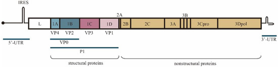 The foot-and-mouth disease virus is a member of the picornavirus family. The genome of FMDV, which is over 8000 bases in length, includes a large open reading frame (ORF) encoding a polyprotein that is processed into mature polypeptides. The structural proteins that form the icosahedral capsid of the virus—VP1, VP2, VP3 and VP4—are encoded by genes 1D, 1B, 1C and 1A, respectively. Non-structural proteins encoded by genes 2A, 2B, 2C and 3A, 3B, 3Cpro, 3Dpol and Lpro [10], are mainly responsible for FMDV maturation and replication. Moreover, 5′and 3′ untranslated regions (UTRs) are also important for the replication and translation of viral genomes [11] (Figure 1). The viral proteins commonly used in vaccines are VP1, VP2, VP3, as well as 3A and 3D in the context of assembled capsids or as antigenic peptides.