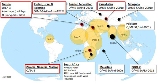 Recent FMD global outbreaks (new headline events reported January to March 2022 are highlighted) with endemic pools highlighted in orange. Source: WRLFMD. Map conforms to the United Nations World.