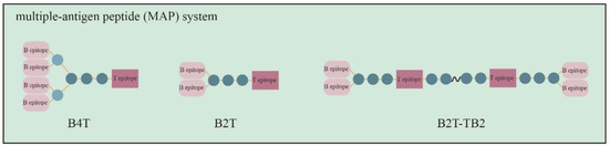 T-cell and B-cell epitopes are the key factors in the development of synthetic peptide vaccines. The non-structural 3D proteins (amino acids 56–70) in FMDV have been used in synthetic peptide vaccines [69,70]. Swine which were inoculated with B2T-3D induced the same level of neutralizing antibodies and IFN-γ as B2T-3A, and inoculation with B2T-3D induced even more IFN-gamma [71]. The cross-neutralizing antibody titer induced by B2T-3D was higher than that included by B2T-3A. The B2T-TB2 peptide, with six epitopes, is formed by two B2T molecules and can induce a high level of protective mucosal IgA response in domestic swine infected with FMDV [72]. The structure also induced strong humoral immunity against classical swine fever virus (CSFV), a pestivirus within the family Flaviviridae