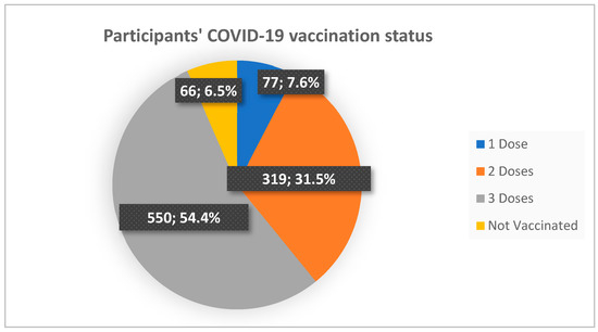 The majority of the study sample were vaccinated for COVID-19 (N = 946, 93.5%) and more than half had taken three doses (N = 550, 54.4%) (Figure 1).