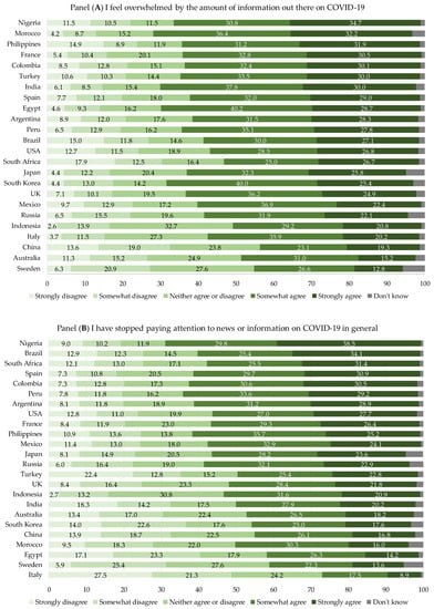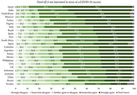 Responses (%) of the 23,482 young respondents to the international survey “Social Media & COVID-19” about the sentiment of agreement with three statements in 24 countries worldwide. Panel (A): I feel overwhelmed by the amount of information out there on COVID-19; Panel (B): I have stopped paying attention to news and information on COVID-19 in general; Panel (C): I am interested in news of a COVID-19 vaccine.