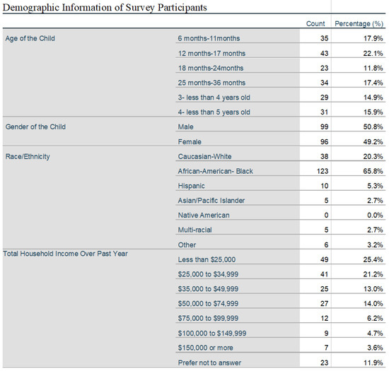 From May 31st through July 5th, 2022, individuals presenting to the Children’s Hospital of The King’s Daughters General Academic Pediatrics (CHKD GAP) clinic were approached by a research assistant upon entrance into the clinic. The CHKD GAP clinic is primarily a safety net pediatric practice with a large majority of patients on Medicaid or Medicaid managed care in Norfolk, VA. The research assistant assessed the individual’s eligibility to participate in the survey, informed the individual of the purpose of the study, and obtained consent. Inclusion criteria included individuals with non-COVID-19 vaccinated children aged 6–59 months. Individuals who agreed to participate were given a 23-question multiple choice survey that assessed their willingness to vaccinate their children based on demographic information, existence of pre-existing conditions, personal beliefs, and possible motives, and where they receive their information concerning vaccines. The survey provided 18 pre-selected answer choices and participants were instructed to chose their top 3 sources for information about COVID-19 vaccines. A copy of the survey is available in the Supplementary Materials. Individuals with more than one child within the 6–59-month age group who were not COVID-19 vaccinated were instructed to only complete one survey and use the information for the youngest qualifying child. In the case of a qualifying family returning to the clinic on another date, they were not asked to participate again and their future attendance was not counted. In cases where eligibility status could not be attained or translation services were unable to be provided, individuals were marked as ineligible and not counted towards the total. The distributed survey was available in English without translations offered. If the individual was not proficient in English and did not feel comfortable completing the survey, it was not distributed. 40 surveys were not distributed due to the participant not confident in their ability to answer the English-language survey. Surveys were collected by a member of the CHKD GAP clinic staff or a research assistant directly after the visit. Surveys completed with a signed consent were entered into the database repository called REDCAP for data analysis. Surveys that were not completed or had no signed consent were not entered into REDCAP, but were counted to determine the total number of surveys distributed. Individuals who were assessed to be eligible but denied participation before a survey could be distributed were also counted to determine the eligible population of the CHKD GAP clinic. Chi-Square Goodness of Fit tests and Fisher’s Exact tests were utilized to analyze associations between variables. All statistical tests were performed using SPSS.26 (Chicago, IL) and were two-sided with p < 0.05 being considered statistically significant. Logistic regression model was also used to calculate Odds Ratio and 95% Confidence Interval.