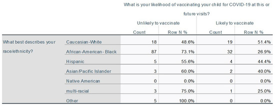 Individuals were divided into two groups ‘unlikely to vaccinate’ (N = 131) and ‘likely to vaccinate’ (n = 60) based on their responses within the survey. Individuals who marked that they were ‘unlikely to ever vaccinate’ or ’unlikely but may consider in the future when [they] know more’ were grouped into the ‘unlikely to vaccinate’ category. Individuals who marked ‘unlikely today but will do it in the future from what I know now’, ‘likely would do it today if I had time so will schedule later’, ‘very likely to do it today if available’ and ‘my child has received the vaccine’ were grouped into the likely to vaccinate’ cohort. Sources of hesitancy were assessed and compared between the two groups. A majority (78/131) of individuals who were ‘unlikely to vaccinate’ responded that they needed more information to make an informed choice. 27% (36/131) of these same individuals believed that the vaccine was more likely to harm their child than help them and 29% (38/131) wanted to see more children immunized first before immunizing their own. There was a lack of trust in the establishment of government/healthcare with increased responsiveness by the ‘unlikely to vaccinate’ group (28/131). When grouped by ethnicity those identifying as Caucasian were significantly more likely to vaccinate (51% or 19/37) compared to African-Americans (26% or 32/109, p = 0.007). Due to limitations in sample size, comparisons could not be made for other groups (Figure 2).