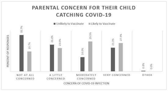 Parental concern for their child catching COVID-19 was assessed for the ‘unlikely to vaccinate’ and ‘likely to vaccinate’ groups (Figure 3). There was a statistically significant difference between the two groups, with the ‘unlikely to vaccinate’ group displaying a bimodal concern for their child’s COVID-19 susceptibility (p = 0.012). Individuals who were more concerned about their child catching COVID-19 were more likely planning to vaccinate their children in the future (p = 0.012). There was no statistical difference for the concern of one’s child catching COVID-19 between African-American and Caucasian groups (p = 0.41).
