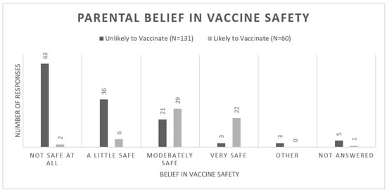 Bar chart displaying the number of responses versus parental belief in COVID-19 vaccine safety. There was a statistically significant difference between the two groups (p < 0.001).
