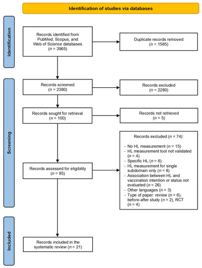 Nevertheless, while HL is a predictor of participation in cancer screening programs [22], a clear relationship between HL and vaccination behavior has not yet emerged [23]. In fact, despite the growing number of studies that have investigated the influence of HL on an individual’s behavior towards vaccination [23,24], there are few reports of HL being a determinant [23]. In addition, factors including heterogeneity in the outcomes investigated and the instruments used for assessment, as well as differences in the vaccine type and the target populations, have made it difficult to generalize the results [23,25,26]. Therefore, the aim of this systematic review was to update and summarize findings on the association between HL and vaccination behavior. We considered both intention to vaccinate and vaccination status, aiming to provide a comprehensive picture of the vaccination decision-making process and to support the implementation of public health strategies that promote vaccination uptake.