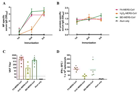 Mouse splenocytes were isolated from spleen tissues, as previously reported []. The mouse IFN-γ ELISPOT kit (BD Biosciences, San Jose, CA, USA) was used to detect IFN-γ-secreting T-cells. Briefly, mouse splenocytes were seeded at 1 × 106 cells/well in ELISPOT plates and stimulated with 10 µg/well inactivated MERS-CoV for 24 h at 37 °C. Spot numbers were counted using ImmunoSpot® (Cellular Technology Limited, Cleveland, OH, USA) and analyzed using GraphPad Prism version 7 (GraphPad Software, San Diego, CA, USA).