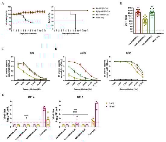 To determine the minimum dose at which a protective immune response was induced, we conducted an additional experiment. Therefore, only 1 μg of the FA group showed a 100% survival rate without weight loss (Figure S1). However, in the other groups, survival rates were less than 20%, and a loss of body weight was also observed. These results suggest that 1 μg of FA-inactivated MERS-CoV was sufficient to induce potent immune responses in immunized mice.