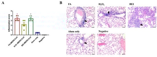 Previously, it was reported that inactivated severe acute respiratory syndrome (SARS)-CoV and MERS-CoV resulted in hypersensitive lung immunopathological reactions with eosinophil infiltration after wild-type virus challenge in mice [,]. Li et al. also confirmed that more eosinophils were observed in the lungs of mice immunized with inactivated MERS-CoV compared with a parainfluenza virus (PIV) 5-based vaccine expressing the MERS-CoV envelope spike protein (PIV5/MERS-S) []. Eosinophil infiltration induced by the Th2 immune response may be considered a risk indicator of a hypersensitive response when applied to humans. In our histological results, inflammatory cell infiltration was observed in the lungs of the inactivated MERS-CoV groups, as previously reported. However, the H2O2 group showed a lower inflammation score than the other groups, suggesting the inflammatory response differs according to the inactivation method. In the immunized group, the virus was not detected and showed sufficient protective immune responses, whereas, in the alum-only group (positive control group), the virus was detected at a high titer (104 PFU/mL) and almost no immune response. These results suggest that inactivated MERS-CoV has potential as a vaccine candidate, although lung hypersensitivity reactions were observed.