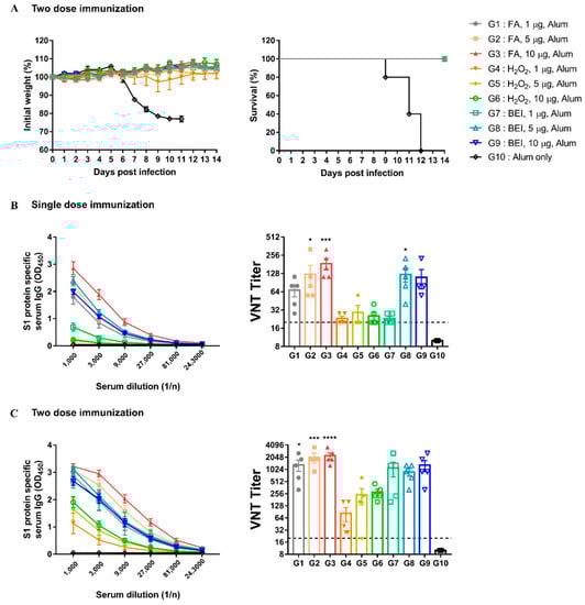 To optimize the dose and number of immunizations for the best immunogenicity and safety, hDPP4 mice were immunized with different doses of inactivated MERS-CoV once or twice at two-week intervals. After the second immunization, all immunized groups (G1 to G9) survived the challenge, except for the G10 mock-treated control (Figure 4A). As shown in Figure 4B,C, the antibody response increased as the dose and immunization number increased. In addition, the S1 protein-specific IgG and neutralizing antibody titers of the FA (G1 to G3) and BEI groups (G7 to G9) were higher than those in the H2O2 groups (G4 to G6) at the same dose (Figure 4B,C). Particularly, in the FA group, the neutralizing antibody titer was more than four times higher than that of other groups when 1 μg was immunized.